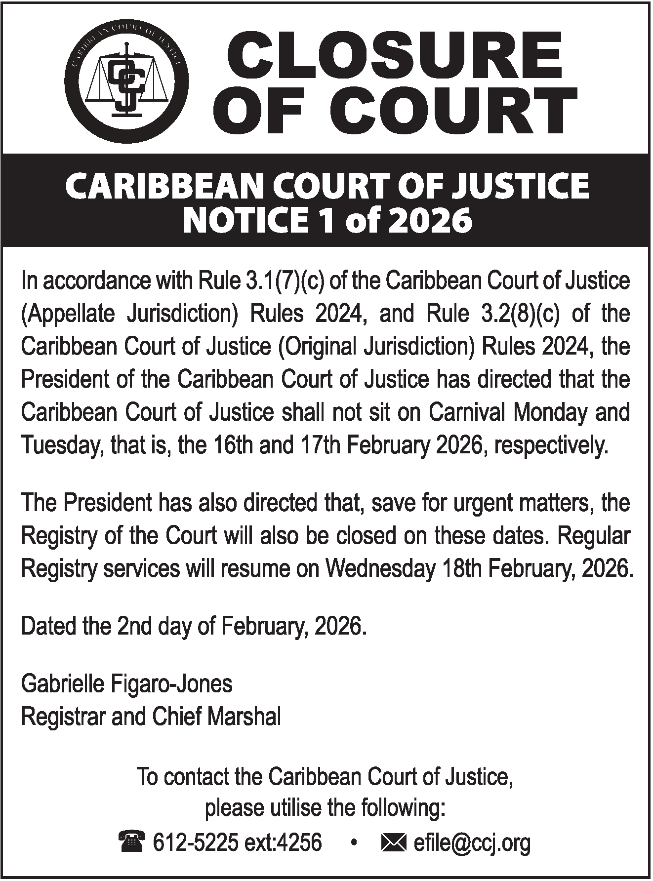 The Caribbean Court of Justice wishes to advise members of the public that the Court will be closed on 16 and 17 February 2026, that is, Carnival Monday and Tuesday in Trinidad and Tobago, save for urgent matters.
